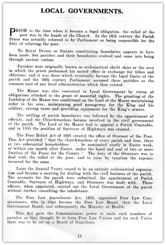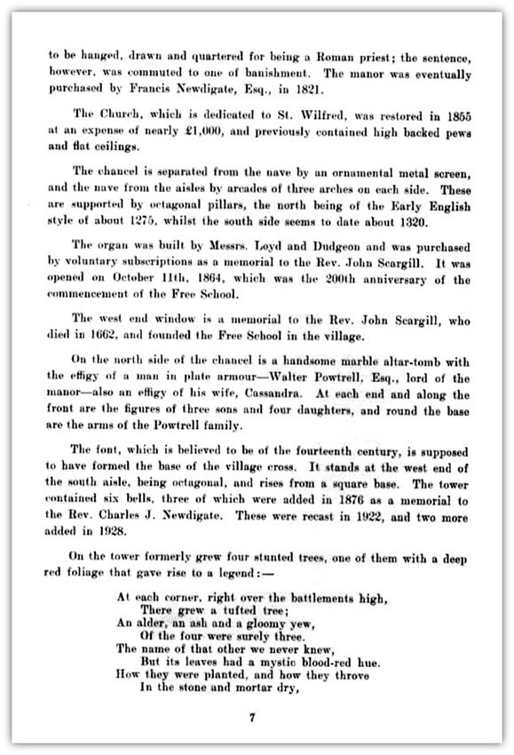 Continued from page 6 (above) to be hanged, drawn and quartered for being a Roman priest; the sentence, however, was commuted to one of banishment. The manor was eventually purchased by Francis Newdigate, Esq., in 1821. The Church, which is dedicated to St. Wilfred, was restored in 1855 at an expense of nearly £1,000, and previously contained high backed pews and flat ceilings. The chancel is separated from the nave by an ornamental metal screen, and the nave from the aisles by arcades of three arches on each side. These are supported by octagonal pillars, the north being of the Early English style of about 1275, whilst the south side seems to date about 1320. The organ was built by Messrs. Loyd and Dudgeon and was purchased by voluntary subscriptions as a memorial to the Rev. John Scargill. It was opened on October 11th, 1864, which was the 200th anniversary of the commencement of the Free School. The west end window is a memorial to the Rev. John Scargill, who died in 1662, and founded the Free School in the village. On the north side of the chancel is a handsome marble altar-tomb with the effigy of a man in plate armour-Walter Powtrell, Esq., lord of the manor-also an effigy of his wife, Cassandra. At each end and along the front are the figures of three sons and four daughters, and round the base are the arms of the Powtrell family. The font, which is believed to be of the fourteenth century, is supposed to have formed the base of the village cross. It stands at the west end of the south aisle, being octagonal, and rises from a square base. The tower contained six bells, three of which were added in 1876 as a memorial to the Rev. Charles J. Newdigate. These were recast in 1922, and two more added in 1928. On the tower formerly grew four stunted trees, one of them with a deep red foliage that gave rise to a legend:- At each corner, right over the battlements high, - 7 - Continued from page 7 (above) The old men knew not-tho' often they strove Appended is a list of Rectors of the parish which is as complete as available records will permit.