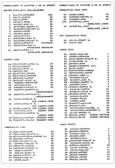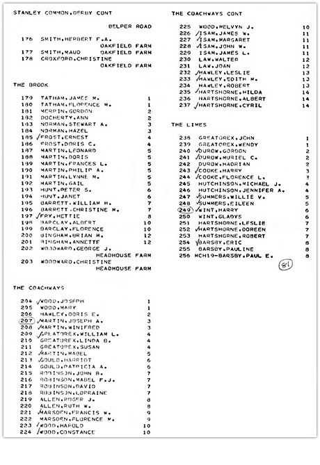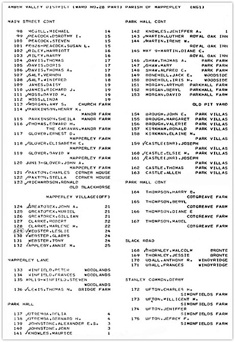 MAPPERLEY- 1895 I thought this extract from Bulmer's History, Topography and Directory could be of interest - Phil Wyles Mapperley, from Bulmer's History, Topography and Directory of Derbyshire, 1895. Mapperley is a small parish and township, containing 981 acres, in the hundred of Appletree, electoral division of Sandiacre, petty sessional division of Smalley, union and county court district of Belper, and Deanery of Ilkeston. It is under the jurisdiction of a parish council of six members, and it elects one guardian and rural district councillor. The total extent of land under assessment is 940 acres, rateable value £3,234, and the population, in 1891, was 531. A. M. Mundy, Esq., is lord of the manor; and that gentleman, F. A. Newdigate, Esq., and W. D. N. Drury-Lowe, Esq., are the principal landowners. Park Hall is a small hamlet a little North West of the village. Here was the mansion of the Strelleys, but not a vestiage of the building now remains. Mapperley is one of the parishes entitled to benefit in the Free School of West Hallam, founded by the Rev. John Scargill. Letters, via Derby arrive between 6:00 and 8:00 a.m., and are despatched between 7:00 and 8:00 p.m., week days only; Mrs. Keziah Hart, sub-postmistress. Postal Orders issued but not cashed. Parish Councillors—Rev. John Magens Mello, M.A.., chairman; William Else, James Durow, Albert Pounder, John Fletcher, Humphrey Hartshorn, Charles Thornley. Clerk, A. Pitt. MAPPERLEY- 1941 I thought this extract from Kelly's Directory of Derbyshire 1941 could be of interest - Phil Wyles A copy of the entry, for Mapperley, from Kelly's Directory of Derbyshire 1941 MAPPERLEY is a parish 2 ½ miles north-west from Ilkeston station on the London and North Eastern railway, and 7 north-east from Derby, in the Belper division of the county, hundred of Appletree, petty sessional division of Smalley, rural district of Belper, county court district and rural deanery of Ilkeston, archdeaconry and diocese of Derby. The Nutbrook canal crosses the eastern side of the parish. The ecclesiastical parish was formed 22 July, 1870, from the civil parish of Kirk Hallam. The church of the Holy Trinity, built in 1851, is an edifice of stone in the Gothic style, consisting of chancel, nave, south porch, and a western turret containing 5 tubular bells, fixed in 1890, to replace the 2 previous bells, dated 1851: there are 200 sittings. An oak lych-gate was erected in 1922, at a cost of £400, in memory of the men connected with this parish who fell in the Great War, 1914-18. The register dates from the year 1851. The living is a vicarage, net yearly value £350, with residence, in the gift of the Bishop of Derby, and held since 1938 by the Rev. Albert Edward Swain, of Emanuel College, Saskatoon. There is a Methodist chapel. This is a colliery district. A charity of £3 yearly, left in 1817, by the Rev. Frank Gisborne, sometime rector of Staveley, is for clothing. Capt. J. A. E. Drury-Lowe J.P. and the Mapperley Colliery Co. Ltd. are the principal landowners. Gas and electricity are available. Water is supplied by the Belper Rural District Council. The soil is clay; subsoil, clay. The area is 982 acres of land and inland water; the population in 1931 was 435. Post Office. Letters through Derby. West Hallam nearest M. 0. & T. office PRIVATE RESIDENT, Commercial. See Also Kelly's Directory of the Counties of Derby, Notts . . . 1891 (Mapperley) Register of Electors 1976-77