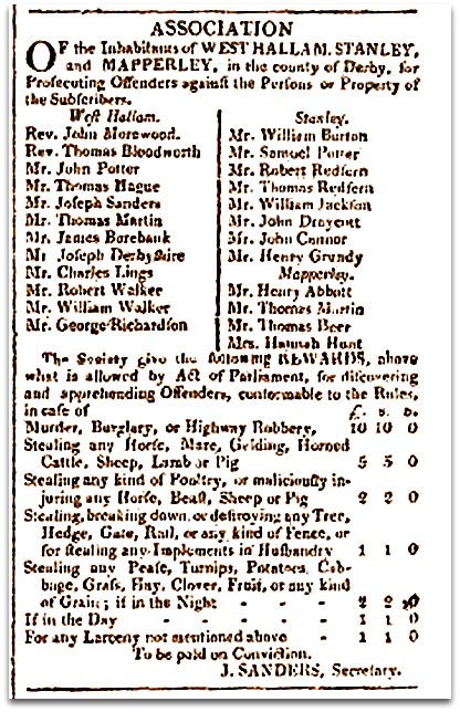 There are four members mentioned in Mapperley, and doubtless these will have been farmers. These associations were groups of "middling-sorts" who clubbed together to share the expenses of carrying out a prosecution should any of them become victims of crime. This was, of course, in the days before any form of police force existed, and all prosecutions were the responsibility of the complainant - and they could be very expensive indeed - a sheep-stealing case in Dale Abbey around this time cost over £50 in expenses. There is an identical advert from 1812 (same Mapperley names in it), and an advert from 1811 advertising a reward when a sheep was stolen at West Hallam Heanor and District Local History Society The Nutbrook Canal, Derbyshire