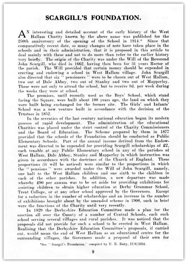 - 8 - SCARGILL'S FOUNDATION. AN interesting and detailed account of the early history of the West Hallam Charity known by the above name was published for the 250th anniversary of the opening of the School in 1914. Since that comparatively recent date, so many changes of note have taken place in the schools and in their administration, that it is proposed in this article to deal mainly with these and not to do more than refer to the earlier history very briefly. The origin of the Charity was under the Will of the Reverend John Scargill, who died in 1662, having then been for 31 years Rector of the parish. The Will provided that certain money should be expended in erecting and endowing a school in West Hallam village. John Scargill also directed that six pensioners" were to be chosen out of West Hallam, two out of Dale Abbey, two out of Stanley and two out of Mapperley. These were not only to attend the school, but to receive 9d. per week during the weeks they were at school. The premises, until recently used as the Boys' School, which stand facing the Square, were built about 100 years ago, the land on which they were built being exchanged for the former site. The Girls' and Infants' School was a new venture built in accordance with the decision of the Trustees in 1852. In the seventies of the last century national education began its modern process of rapid development. The administration of the educational Charities was placed under the strict control of the Charity Commissioners and the Board of Education. The Scheme prepared by them in 1877 provided that the schools of the Foundation should be conducted as Public Elementary Schools. Part of the annual income derived from the Endowment was directed to be expended for providing Scargill scholarships of £2, each tenable at any Public Elementary school in any of the parishes of West Hallam, Dale Abbey, Stanley and Mapperley in which instruction was given in accordance with the doctrines of the Church of England. These proportions (it will be noticed) were similar to the proportions in which the pensions" were awarded under the Will of John Scargill, namely, one half to the West Hallam children and one sixth to the children in each of the other parishes. In addition, a new departure was made whereby £90 per annum was to be set aside for providing exhibitions for assisting children to obtain higher education at Derby Grammar School, Trent College, or at any other school approved by the Governors. Except for a reduction in the number of scholarships and an increase in the number of exhibitions brought about by the amended scheme in 1908, such in brief were the functions of the Charity until very recently. In 1929 the Derbyshire Education Committee made a plan for the erection all over the County of a number of Central Schools, each such school serving several villages and rural parishes. It was noticed that the proposals did not provide for such a school to be erected in West Hallam. Realising that the Derbyshire Education Committee's proposals, if carried out, would mean the end of West Hallam as an educational centre for the surrounding villages, the Governors made a proposal of their own for "See Scargill's Foundation," compiled by E. E. Raby, 17/6/1914 - 9 - Continued from page 9 (above) building the necessary Central School out of the Scargill endowments, on condition that the Governors should retain the management thereof as a Church school in the same manner that they had always controlled the boys', girls' and infants' schools. Very great difficulty was experienced in getting the proposals approved and much negotiation took place both with the County Education Committee and with the Board of Education, but success was finally achieved. It should here be mentioned that had the Governors chosen to let matters slide, there is no doubt that the useful life of John Scargill's Charity would have been ended and it would soon have drawn to an ignominious close. The new Central school was built on a piece of land specially purchased for the purpose and the money was raised entirely by the Charity. All the capital expended has to be replaced by 60 annual instalments paid out of income.. The total cost was £10,097, which incidentally shewed a saving of £310 against the builder's contract price. The Scargill Senior Central Church of England School was opened with due ceremony by Captain H. Fitzherbert Wright on the 20th November, 1935, and dedicated by the Venerable the Archdeacon of Derby. A service of thanksgiving, conducted by the Rector of West Hallam, was held in the Parish Church the same evening. The new school serves the children of the original Scargill parishes, and West Hallam has now the satisfaction of having the finest and best equipped central school in Derbyshire in its boundaries. Since the erection of the new school there have been two further changes respecting exhibitions and scholarships. The scholarships had for some years been an anachronism, and as elementary schools had long been free, the large amount of money annually expended on them was wasted. The Board of Education, therefore, abolished the scholarships by the 1934 Scheme. The exhibitions, on the other hand, were continued and are now more useful than ever in assisting parents to send promising children to secondary schools and in some cases to universities, colleges, teachers' training colleges and other places of higher education and technical training. In order to ensure that the exhibitions are awarded strictly upon merit and to children of the proper age, the Governors have arranged with the Derbyshire Education Authority for the exhibitions to be awarded upon the results of the County Minor Scholarship examination. If a child from the Scargill parishes is clever enough to be awarded a County Minor Scholarship (and the parents need the assistance), then he or she receives one. The Governors are then sent a list of the next best candidates and the best of 