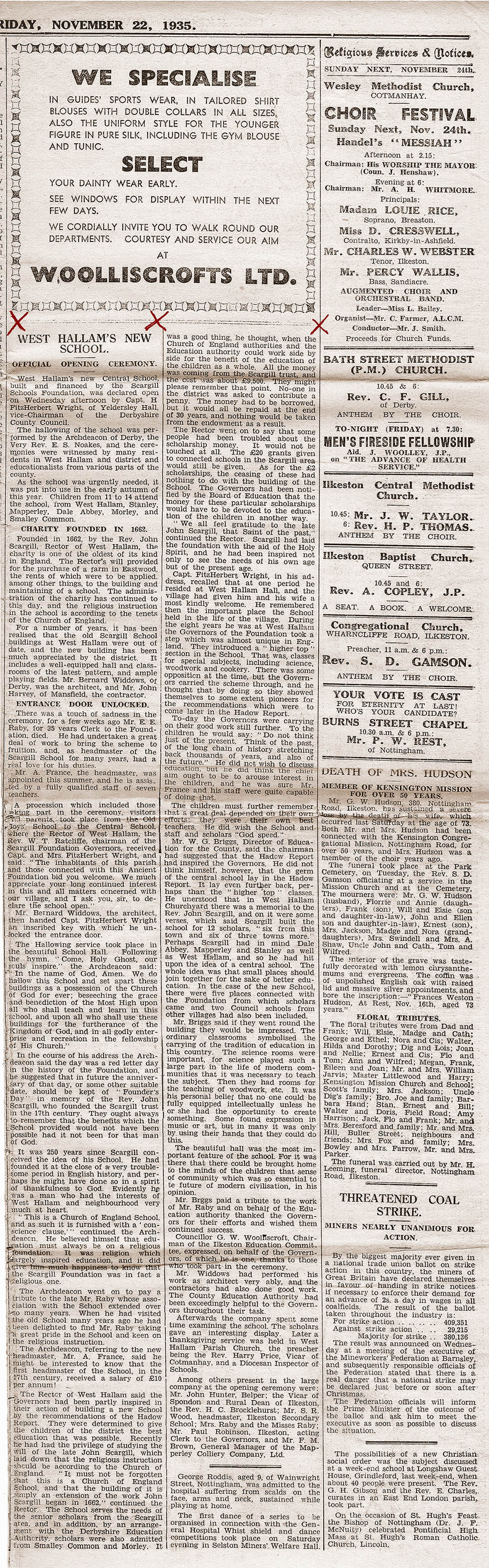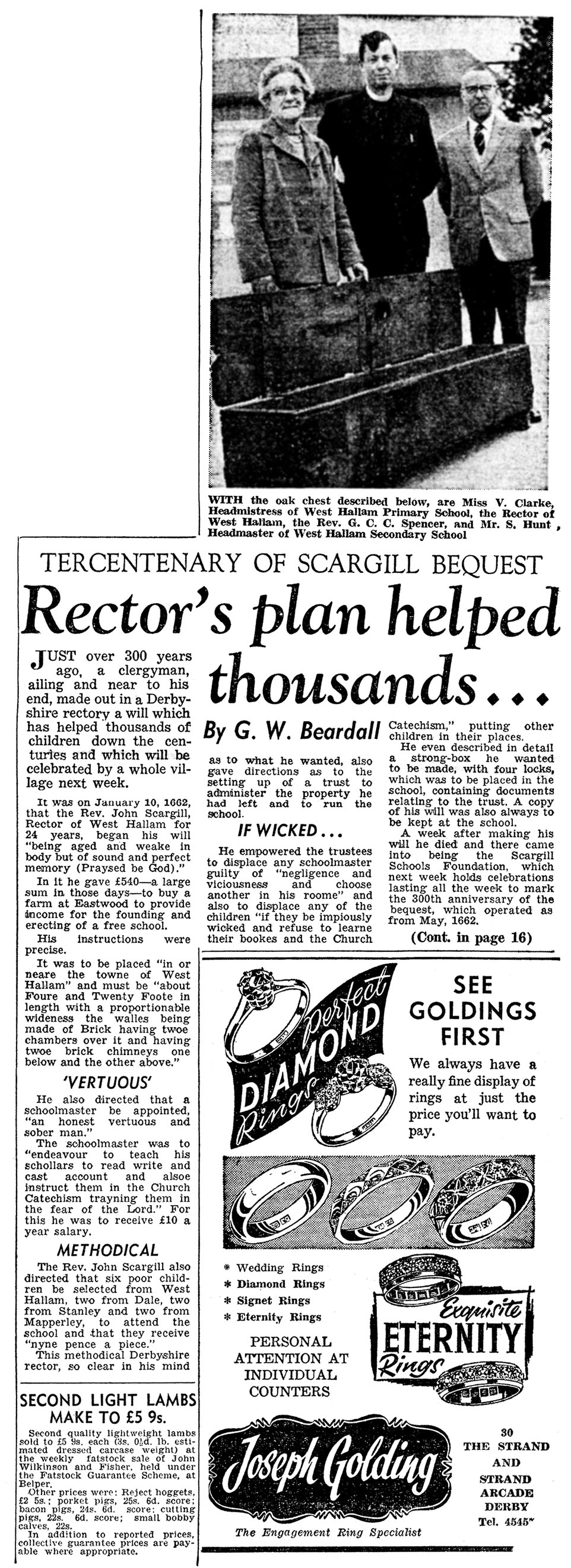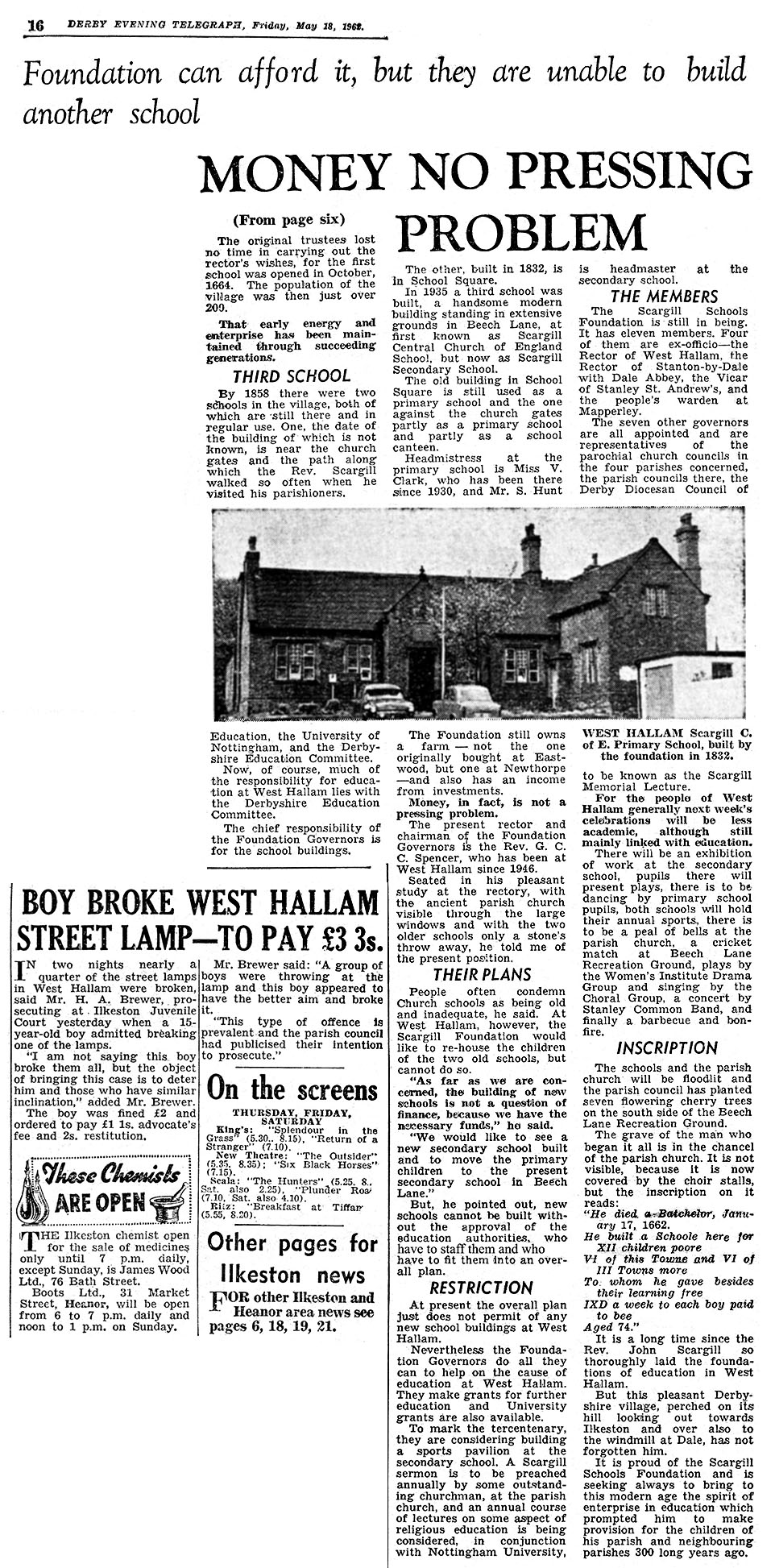 West Hallam 1935 Newspaper re Scargill New School DERBY EVENING TELEGRAPH FRIDAY MAY 18th 1962 West Hallam School Newspaper Article 1962