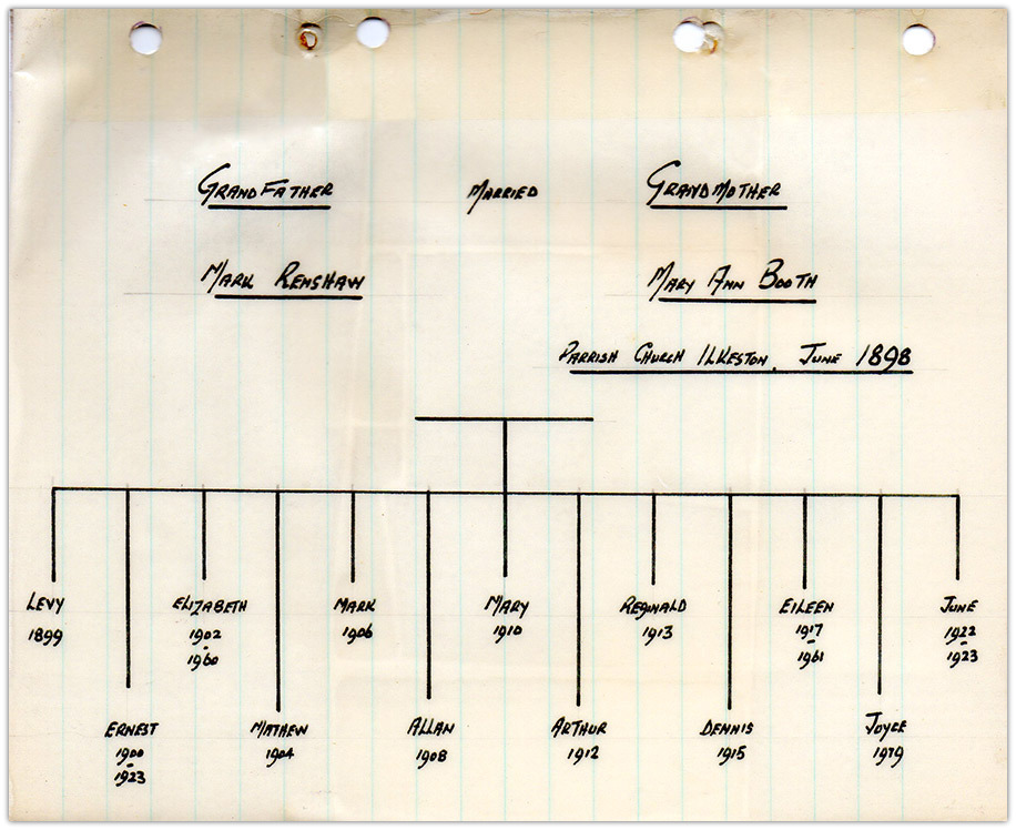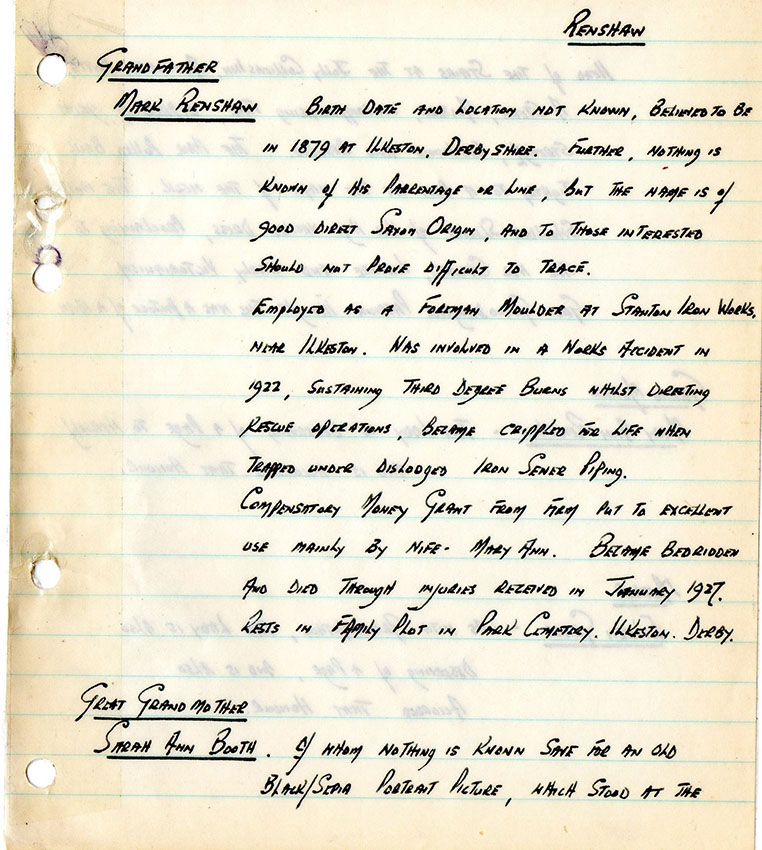 Renshaw Family Grand Father Mark Renshaw Birth date and location not known, believed to be in 1879 at Ilkeston, Derbyshire. Further, nothing is known of his parentage or line, but the name is of good direct Saxon Origin, and to those interested should not prove difficult to trace. Employed as a Foreman Moulder at Stanton Iron Works, near Ilkeston. Was involved in a works accident in 1922, sustaining third degree burns whilst directing rescue operations. Became crippled for life when trapped under dislodged iron sewer piping. Compensatory money granted from firm put to excellent use mainly by wife, Mary Ann. Became bedridden and died through injuries received in January 1927. Rests in Family Plot in Park Cemetery, Ilkeston, Derbyshire.