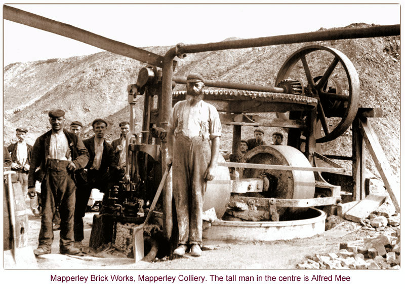 Mapperley Colliery Brickworks near Ilkeston. The below is taken from a newspaper cutting but some words are missing shown as '?' Bricks, millions of them were individually used in the construction of pit shafts, engine-houses and colliery company ? the clay dug and kilns erected on site. From the 1850’s onwards many of the larger companies developed quite extensive brickworks and by the end of the nineteenth century ? Grassmore and Clay Cross Companies were each producing over 3 million hand made bricks each year. Brickmaking was a very heavy and skilful job and an idea of the speed and skill required to make bricks can be appreciated from the report of a brickmaking match at Mossborough in 1887, between William Topley and Eli Irons – Each man worked under the usual conditions for two hours, having the services of an assistant to supply clay and two boys to lay bricks. The stake was 50 shillings a-side. Topley went on first and worked at a uniform rate throughout making 1.328 bricks, an average of 11 bricks a minute.  Irons, who appeared to be favourite started at a very fast rate making 14-15 bricks a minute, afterwards he fell off a little, but with a total of 1,490 an average of 12 a minute he won the match.           - My thanks to Margaret Cooke (nee Lodge) for providing the above - Disclaimer - Copyright - Is this page correct? Something wrong or missing? Please let me know. Also contributions very welcome  |