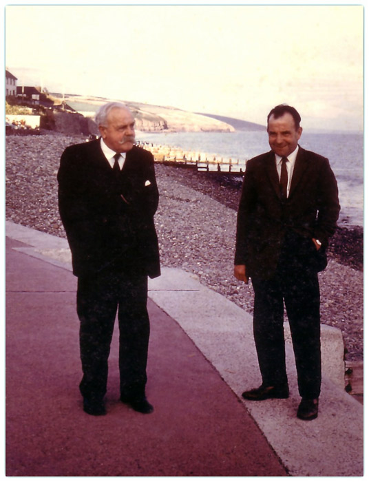 1971 This is the last photo I have of Charles Hill and Henry together. When the farm was sold in 1968 Henry went to be the farm manager at Mountford House School on Simon Lane. Gladys Hill also worked there as the cook and for a short time my sister Barbara also worked there. It was taken at Amroth in South Wales. They were staying with the three ladies from Mountford House School (North End) who had a cottage on the sea front at Amroth.