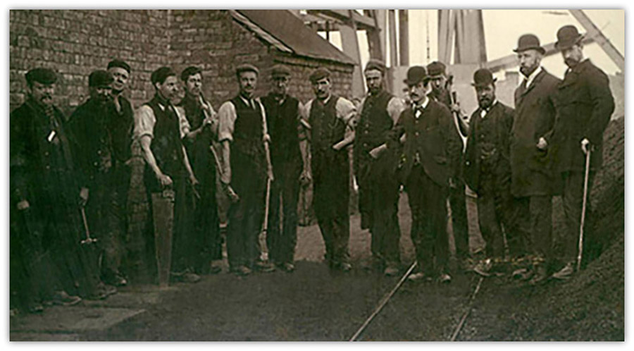 Fitting the Headgear George Spencer presented a paper on the fitting of the Headgears at Mapperley Colliery to the Midland Counties Institution of Engineers (*2) full report below: THE MIDLAND COUNTIES INSTITUTION OF ENGINEERS GENERAL MEETING DECEMBER 6TH, 1902. Mr. GEORGE ELMSLEY COKE, PRESIDENT, IN THE CHAIR. Mr. George Spencer (Mapperley Colliery). The new headgear, at Mapperley colliery, constructed of Pitchpine, was erected during the previous year in a field about 300 feet from the pit top, where it awaited a favourable opportunity to be placed in position, without impeding the work of coal turning. Such an opportunity did not occur until the present year, owing to regular trade and other circumstances. Advantage was therefore taken of the August Bank Holiday, which is observed by the miners, and takes place at a time of year when the days are long. It was originally intended to erect the headgear temporarily, so as to ensure the proper fitting of the parts, and to take it to pieces for re-erection close to the pit–top, and in a line parallel to the old one, which it was intended to replace, so that the operation of moving it into its permanent position would be comparatively a simple one. Consequently, no regard was paid to building it in the line which it was found that it would afterwards have to traverse, if moved as a whole. Considering, however, that the headgear was completed in every detail, and that the expense of taking it to pieces and of re-erecting it would be considerable, it was decided to adopt the bolder plan of moving it as it was, and in this decision we were further encouraged by learning that the operations at Pleasley colliery had been entirely successful. It was found, before moving the headgear towards the pit-top, that it was necessary to turn it round through an angle of 90 degrees. A temporary underframe, consisting of strong longitudinal and transverse timbers, having been secured by bolts to the base of the upright and back legs, for the purpose of moving it on rollers, a strong wooden pack to take part of the weight was placed under the centre of gravity of the structure, as determined from the model, which happened to be under the middle transverse timber of the underframe. On this centre, the headgear was rotated by means of a hand-winch, until the front faced the line of traverse; and planks smeared with tub-grease were laid down, upon which the front and back timbers of the underframe would slide. The experiment was then tried of moving the structure forward on a double line of planks, 3 inches thick, by means of rollers, steel tubular pit-props, 5 inches in diameter, being employed. The planks proved capable of bearing the weight, and were used throughout in preference to baulks, which had been especially ordered for the purpose. A week or two prior to the stoppage, the headgear was moved to the pit-top in the manner described (the road, in places, being ballasted and packed up owing to its unevenness) and finished by making a turn, nearly at right angles, to bring it into a position parallel to the old headgear. Two hand-winches, attached to two sets of pulley-blocks, were employed in traversing the headgear, and the time occupied was between 4 and 5 hours. A derrick-pole was then erected between the old and new head-gears, in a position convenient both for raising the new pulleys to the new headgear and for lowering the old pulleys to the ground. The new pulleys were placed upon their pedestals, temporarily secured; and additional transverse timbers were fixed on the underside of the frame, so as to enable the headgear to be rolled sideways over the pit-top, when the time arrived for this work to be done. On Friday, August 1st, 1902, the pit ceased work at the usual time; and at 5 p.m.; when all the men had been drawn out, the work of taking down the wire-conductors and lowering the old pulleys was commenced. By 9 p.m. both winding-ropes had been drawn over the pulleys, the cage-props had been removed, a scaffold had been fixed over the pit, and one of pulleys had been lowered to the ground. It may here be mentioned that work was only continued during daylight, and with the same staff of men throughout. On Saturday morning, work was resumed at 4:30 p. m., and by 10:30 a.m. all arrangements were in readiness for pulling over the old headgear. By means of an old winding-rope attached to the top of the headgear, two locomotives were connected to it, and at a given signal both pulled together. The front and back legs had previously been sawn through, so as to ensure the structure falling in the required direction; and, in 10 seconds from the time of giving the signal, it fell to the ground across the railway exactly as desired. The rest of the day was spent in removing the debris, and in building the foundations (blue bricks set in cement) for the new headgear. By 6 p.m. the new headgear was traversed to its approximate position over the pit, and work ceased for the day. Work was commenced at 6 a.m. on Sunday, and continued until 8 p.m. The headgear was set in its exact position by plumbing from the bed of the pulley-wheels to marks made on the scaffold. During this day all the conductors had been re-fixed to the new headgear, and one winding-rope had been taken over the pulley, thus making it possible to use the pit for lowering or raising men, if required. On Monday, operations recommenced at 6 a.m. and during the day the work was completed, and the tackle and timbers used in moving the structure removed; and at 8:30 p.m. all appliances were made ready for coal-turning on the following day. The headgear at Mapperley colliery is not as large as that at Pleasley, being 41 feet high to the sills, and the weight moved would not exceed 45 tons, including the temporary underframe. But judging from the facility with which the headgear was removed, he (Mr. Spencer) would not hesitate to move one of any dimensions or weight, it being simply a question of